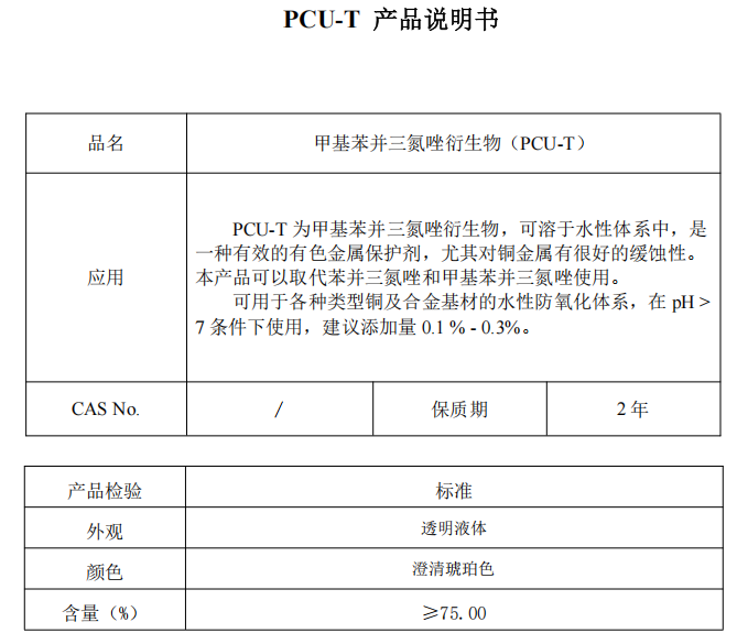 传统TTA因水溶性差,需搭配醇类溶剂使用,易导致铜材表面出现斑点;而PCU-T可直接溶于水,形成均匀的防锈液,在铜材表面形成致密的保护膜,有效抑制在潮湿或高温环境下的氧化腐蚀。