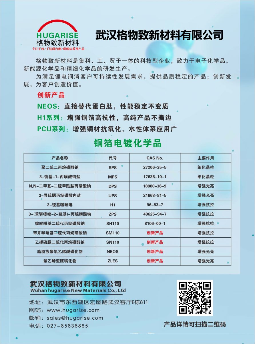 SM110:细化晶粒,具有提升镀层整平和硬度的性能,能显著提升铜箔的抗拉强度。
